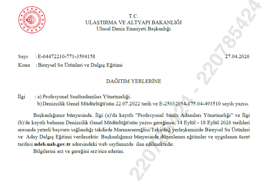 Bireysel Su Ürünleri ve Dalgıç Eğitimi Duyuru